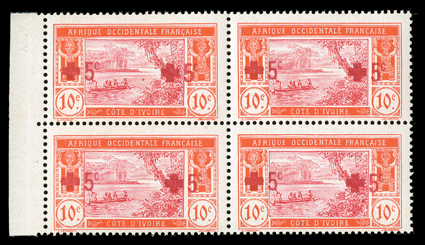 709 nhbl Yvert #58a ImageYvert #58a, 1915 "+5" Surcharge on 10c Red orange and rose, double surcharge, post office fresh left sheet-margin block of four, o.g., n.h., fine; each signed Herman (Scott #B1a; $480.00). (Image) Maury €660