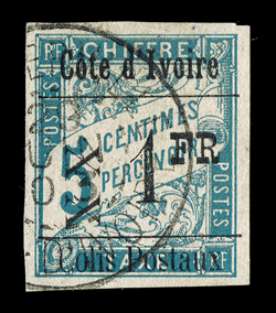 710 O Yvert #CP7d ImageYvert #CP7d, 1903 "Cote d'Ivoire/XX 1 FR/Colis Postaux" Ty. V Surcharge on 5c Blue postage due, a very elusive used example of this parcel post rarity, four large even margins, rich color on fresh white paper, neatly cancelled by 29 June 1903 postmark, choice very fine; signed Pavoille (Scott #Q9; $3,250.00). (Image) €4,500