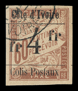711 O Yvert #CP11a ImageYvert #CP11a, 1903 "Cote d'Ivoire/fr 4 fr/Colis Postaux" Ty. III Surcharge on 60c Brown on buff postage due, large even margins all around, lightly cancelled, fresh and very fine; only 216 stamps received the Ty. III surcharge (Scott #Q22; $325.00). (Image) €510
