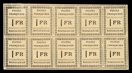 720 og Yvert #14-22 ImageYvert #14-22, 1895 "POSTES/FRANCAISE/Madagascar" Overprints on 5c-5Fr. Peace and commerce cplt., attractive mint set, generally well centered, o.g., some h.r., 1Fr. with a few blunt perfs. at top, otherwise fine-very fine; 5Fr. signed Miro (Scott #14-22; $827.50). (Image) €1,170