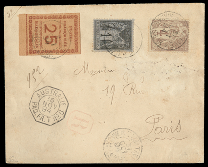 716 c Yvert #11 ImageYvert #11, 1891 25c Brown on buff, bottom margin single tied along with French Colonies 1c Black on lilac blue and 4c Claret on lavender (#46, 48) tied by 31 October 1894 datestamps to registered cover to Paris, octagonal "Australie/Paq.Fr.T No. 6/16 Nov 94" transit and Paris backstamp, last name of recipient expunged and cover with mounting adhesions and tear on reverse, fine and rare usage; signed J-F Brun (Scott #11). (Image) Est. $400-500