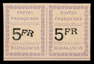 717 og Yvert #13 ImageYvert #13, 1891 5Fr. Violet and black on lilac, without gum as issued, a very rare sound mint horizontal pair, the left stamp showing deformed "FR" in "5FR", being completely free of the myriad faults that plague this fragile paper, ample large margins, wonderfully fresh, very fine; signed J-F Brun and Maury (Scott #13; $4,000.00 for singles). (Image) for singles €5,800