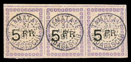 719 O Yvert #13 ImageYvert #13, 1891 5Fr. Violet and black on lilac, seldom seen used horizontal strip of three, each stamp cancelled by neatly struck 31 August 1891 postmark, ample to large margins, the right stamp with a pressed-out vertical crease at left, the left pair completely sound, very fine; a rare multiple as only 1,000 stamps were printed; each signed Calves (Scott #13; $3,000.00 for singles). (Image) for singles €4,500
