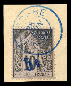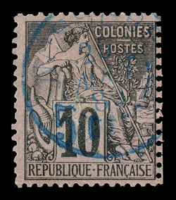 782 O Yvert #8 ImageYvert #8, 1889 "5c" Surcharge on 10c Black on lavender, scarce used example from the second overprinting, light blue 2 August 1889 postmark, fine; only 150 stamps are believed to have been surcharged; signed Calves, Champion and O. Roumet (Scott #3; $1,400.00). (Image) €1,600