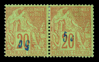 784 og Yvert #9, 9a ImageYvert #9, 9a, 1889 "5c" Surcharge on 20c Red on green, inverted surcharge, an enormously rare horizontal combination pair, the left stamp with inverted surcharge and the right stamp normal, rich color on fresh paper, strong and intact perforations, o.g., h.r., fine; with only 150 stamps believed to have been surcharged, and most of them having been used, this combination error pair may well be unique; signed A. Brun, Calves, Lemarie and Roumet and accompanied by 2010 Roumet certificate (Scott #4, 4a; $8,650.00 for singles). (Image) for singles €10,700