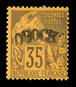 795 og Yvert #31 ImageYvert #31, 1892 "5F" Surcharge on 1Fr. Bronze green and straw, bottom left corner margin single, o.g., l.h., fresh and fine; signed A. Brun twice and Roumet (Scott #31; $600.00). (Image) €900