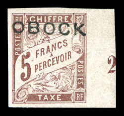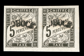 798 nhR Yvert #TT1a ImageYvert #TT1a, 1892 "OBOCK" Curved overprint on 5c Black, reprint overprint, horizontal pair, large to huge margins, immaculate o.g., n.h., extremely fine; both signed Roumet (Scott #J18 Footnote; $400.00 for hinged). (Image) for hinged €800