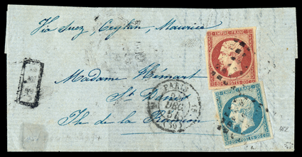 801 c   Image1854 Cover from Paris to Reunion, folded cover to St. Denis franked by France 1853 20c Blue on bluish and 80c Rose on pinkish (#14, 17), both with large margins, except 80c with nick in top left corner, tied by large square grid, "Paris/24 Dec, 54" departure postmark, "Via Suez, Ceylon, Maurice" directive, 4 May 1855 arrival backstamp, very fine usage to this scarce destination; signed Roumet. (Image) Est. $150-200
