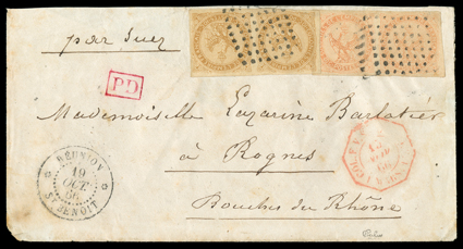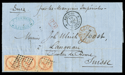 805 c   ImageFrench Colonies Yvert #5, 1859 40c Orange on yellowish, horizontal strip of three, mostly large margins to close at top, tied by two strikes of diamond of dots grid to fresh blue 1865 folded cover to Switzerland, clear "St. Denis, Reunion/19 Mai, 65" datestamp, "Suez" and "par les Menageris Imperiales" directives, red octagonal transit and boxed "PD", Marseille and Bern transit and Langnau arrival backstamps, fresh and very fine; a rare destination from Reunion (Scott #5). (Image) Est. $500-750
