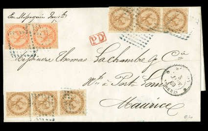804 c   ImageFrench Colonies Yvert #3, 5, 1859 10c Bister on yellow and 40c Orange on yellowish, two vertical strips of three of former and vertical pair of latter, mostly large margins to touching one 10c strip, tied by diamond of dots grids to fresh 1869 folded letter to Mauritius, "St. Denis, Reunion/3 Janv, 69" datestamp, red boxed "PD" and backstamped Mauritius the next day, extremely fine; scarce and colorful inter-island franking; signed Calves and accompanied by his 2001 certificate (Scott #3, 5). (Image) Est. $500-750