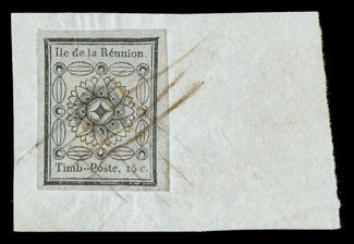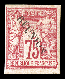 815 og Yvert #15 ImageYvert #15, 1891 "REUNION" Overprint on 75c Carmine on rose, with accent, ample to mostly large margins, o.g., h.r., very fine and quite scarce; signed Behr and accompanied by his 2000 certificate; ex-Gibralter (Scott #15a; $1,200.00). (Image) €1,400
