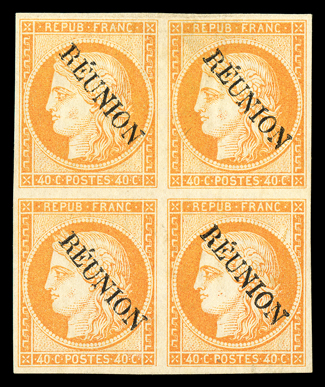 811 ngbl Yvert #11 ImageYvert #11, 1891 "REUNION" Overprint on 40c Orange on yellowish, unused as always, seldom seen mint block of four, large even margins all around, rich color on crisp white paper, extremely fine; signed Miro twice (Scott #11; $2,300.00 for singles). (Image) for singles €2,600