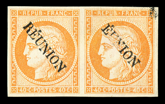 812 ng Yvert #11, 11a ImageYvert #11, 11a, 1891 "EUNION" Error overprint on 40c Orange on yellowish, unused as always, horizontal pair, the right stamp the error, four large even margins, bright color on fresh white paper, a bit of extraneous overprint ink in the top right corner which is characteristic of this, very fine; by far the rarest of all the "Reunion" overprint errors; signed Behr, Calves, Isaac and Roumet and accompanied by 2010 Roumet certificate (Scott #11h; $5,075.00 for singles). (Image) for singles €6,150