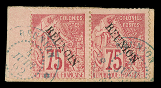 817 p Yvert #27 ImageYvert #27, 1891 "REUNION" Overprint on 75c Carmine on rose, tied to small piece by blue town cancel, fresh color, very fine; signed Bloch and Calves (Scott #27; $525.00). (Image) €650