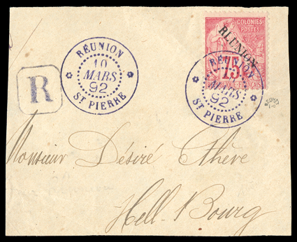 820 p Yvert #27 var. ImageYvert #27 var., 1891 "RLUNION" Error overprint on 75c Carmine on rose, tied to large registered piece by bold blue "St. Pierre, Reunion/10 Mars, 92" datestamp, fresh color, fine and very rare; mentioned in a footnote in Yvert; signed Roumet (Scott #27 var.). (Image) Est. $500-750