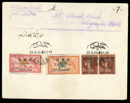 861 c Yvert #PA4-6 ImageYvert #PA4-6, 1921 1pi on 20c to 10pi on 2Fr. Air posts cplt., with a pair of the 1pi on 20c and singles of the other two, all tied by Haleb 22.9.21 c.d.s. postmarks on airmail cover to Alexandrette (receiving backstamp), cover opened at bottom, fine (Scott #C4-6). (Image) Est. $150-200