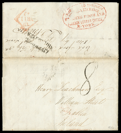 865 c   Image1839 Missionary letter to Ireland via New York, folded letter datelined "Tahiti South Seas/21st Sep 1839" and endorsed on backflap "Rec'd & ford New York Feby 3rd 1840 by your obt servt L.S. Bolton" who took it to another forwarding agent where it received a large red oval "Forwarded Through/Christian's Exchange/Reading Room and/Foreign Letter Office/N-York.", arrived in England with "Liverpool/Ship Letter" handstamp and then forwarded to Dublin with 8 (d) due and red diamond "Mr 11, 40" arrival postmark, very fine; the only recorded letter from Tahiti carried around Cape Horn via New York to Europe; the letter describes missionary hardships in the South Seas; signed Calves and accompanied by his 2003 certificate. (Image) Est. $2,000-3,000