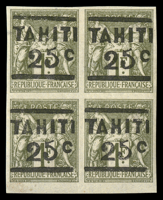 870 og/nhbl Yvert #6 ImageYvert #6, 1884 "TAHITI/25c" Surcharge on 1Fr. Bronze green on straw imperforate, a highly desirable partial bottom sheet-margin mint block of four, with large even margins on the other three sides, wonderfully fresh, with rich color on crisp white paper, o.g., trivial h.r. at top, the bottom left stamp l.h. and the bottom right stamp n.h., extremely fine and choice; each signed Bernichon and additionally signed by Calves and Champion and accompanied by 2006 Roumet certificate (Scott #4; $3,000 for hinged singles). (Image) for singles €4,000+