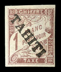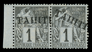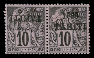 871 og Yvert #7 ImageYvert #7, 1893 "TAHITI" Overprint on 1c Black on lilac blue, left sheet-margin horizontal pair, the right stamp with usual diagonal overprint and the left stamp with horizontal overprint, strong and intact, o.g., fine and rare; only 200 stamps were overprinted; both signed Calves and accompanied by 2007 Roumet certificate (Scott #5; $1,900.00). (Image) for singles €2,400+