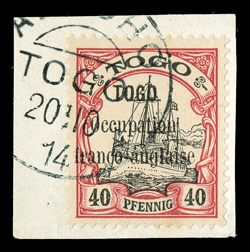 879 O Yvert #43 ImageYvert #43, 1915 "05" Surcharge and "TOGO/Occupation/franco-anglaise" overprint on 3pf Brown, a lovely used example of this very rare stamp, deep luxuriant color on fresh paper, neatly cancelled, very fine; signed Calves and Maury; a mere 61 stamps were surcharged (Scott #164; $4,400.00). (Image) €6,300
