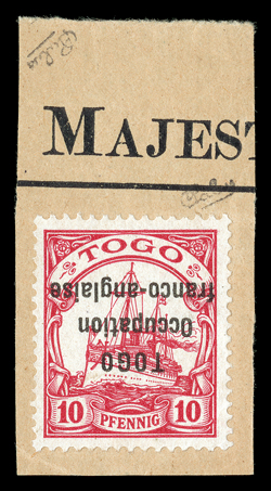 880 og Yvert #45a ImageYvert #45a, 1915 "TOGO/Occupation/franco-anglaise" overprint on 10pf Carmine, inverted overprint, uncancelled and affixed to piece with part OHMS imprint, luxuriant color on bright white paper, very fine; a great rarity of both Togo and of all the French colonies as well, with only ten examples having been recorded; signed Calves twice and Holcombe and accompanied by 1998 Behr and 2004 Calves certificates; ex-Gilbert (Scott #166a; $27,000.00). (Image) €40,000