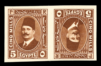 901 P 135 var. Image#135 var., 1927-37 5m Dark red brown, imperforate, tete-beche pair, two scarce pairs with "Cancelled" printed diagonally on reverse, one a cross-gutter example, very fine. (imagea) (Image) Est. $150-200