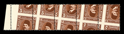 903 nh 135 var. Image#135 var., 1927-37 5m Dark red brown, collection of freaks and oddities, four dramatically misperfed items with wild shifts of the design, includes a cross-gutter strip of ten, strip of five, block of four and a pair, o.g., n.h. (Image) Est. $200-300