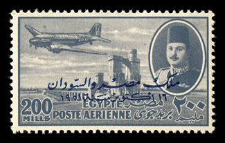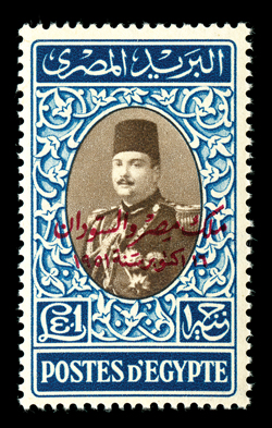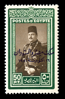 905 TC C53-64 var. Image#C53-64 var., 1952 King Farouk trial color overprints, complete set of the 37 different trial color overprints, 2m with green instead of red overprint, each with Koubbeh Palace handstamp on reverse, accompanied by the regular issued set, all o.g., n.h., very fine; a difficult set to find complete as only 50 sets exist. (Image) Est. $400-500