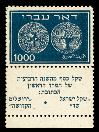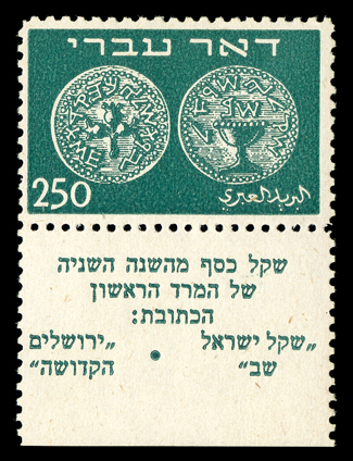 911 nh 7-9 Image#7-9, 1948 250m-1,000m Coins cplt. in full tabs, the 500m and 1,000m are especially well centered, o.g., n.h., accompanying certificate notes light fingerprints and #7 and #8, as well as tiny gum loss on one perforation on #8, all of which are quite inconsequential, overall a very fine and handsome set; 2000 Tsachor certificate. (imagea) (imageb) (Image) $7,500.00