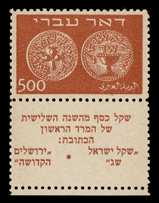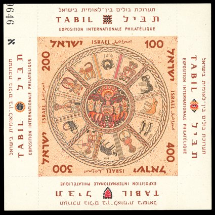 913 nh 132 var. Image#132 var., 1957 Tabil souvenir sheet, with control number at top left, with the majority of the control number 0646 printed on the sheet by mistake, o.g., n.h., very fine; an elusive variety; accompanied by a 1959 letter from the Israel Ministry of Posts (Bale #MS2a). (Image) Bale $525.00