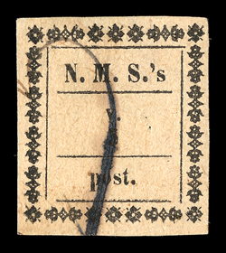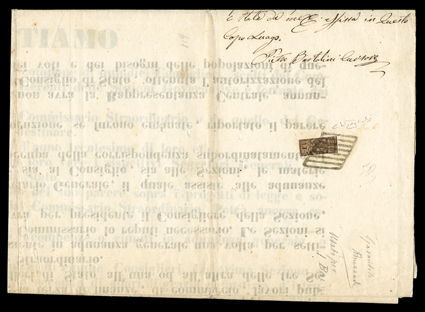 914 c 4e Image#4e, 1852 3b Black on brown, one third used as 1b on circular, the center vertical third, ample to large margins at top and bottom, beautifully tied by lozenge grid to large 1859 printed circular from the Special Police Inspector of Bologna to Loiano, with that town's bold straightline arrival handstamp, fresh and extremely fine; a scarce and attractive trisect usage from Romanga, after the formation of the provisional government, to pay the 1b circular rate; signed Emilio Diena, R. Mezzadri and Raybaudi, as well as being accompanied by the latter's 1993 "Gold" certificate; ex-Perera and Gross (Sassone #4Aa). (Image) $3,600.00