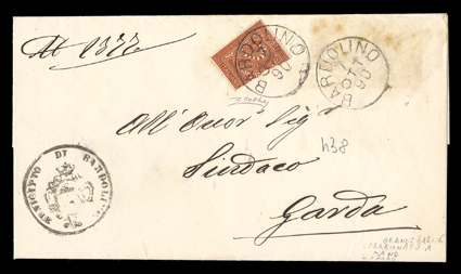 915 c 25 var. Image#25 var., 1866 2c Orange brown, Turin printing, half used as 1c, tied by Bardolino 7.10.1890 c.d.s. on folded letter to Garda, correctly paying the 1c rate, cover with some staining at the top right, otherwise fine; an enormously rare bisect that is not listed in Scott or Sassone; 2002 Colla certificate (Sassone #T15 var.). (Image) Est. $2,000-3,000