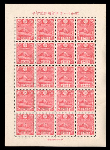 917 nh 222a Image#222a, 1935 1½s New Years miniature sheet of twenty, pristine o.g., n.h., usual mild natural gum bends, extremely fine. (Image) for hinged $700.00