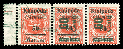 918 og/nh Mi. #233 var. ImageMichel #233 var., 1923 60c on 50M on 25c Dark cinnamon red, major printing variety of the 60c green surcharge, left margin horiz. strip of three, the right two stamps have a normal strong green surcharge, but the left stamp has no green surcharge from that press pass, producing the variety with and without surcharge, however there is a light second green surcharge misplaced and at an angle that is found in the left and center stamp with just traces of it in the right stamp, this produces the variety of double overprint on center stamp, o.g., hinged in the center stamp only, this variety was probably produced by a malfunction of the press as evidenced by a light printing crease in the left stamp and an extensive smudge of the green overprint ink on the gum side, a most interesting variety for the specialist with neither variety listed by Michel; 2000 Erdwien BPP certificate; ex-Lewis (Scott #N90 var.). (Image) Est. $300-400