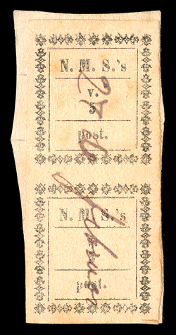 920 ogO Facit #MI1 ImageFacit #MI1, 1894 5v Missionary stamp, lot consisting of one unused single, two used singles and one used vertical pair, cancelled by ms. as always, all but one single have full large margins all around, the pair has some faint toning, one used single with a tiny pinhole, otherwise fine-very fine; an attractive lot of these seldom seen Missionary stamps. (imagea) (imageb) (imagec) (Image) Facit 14,000SK