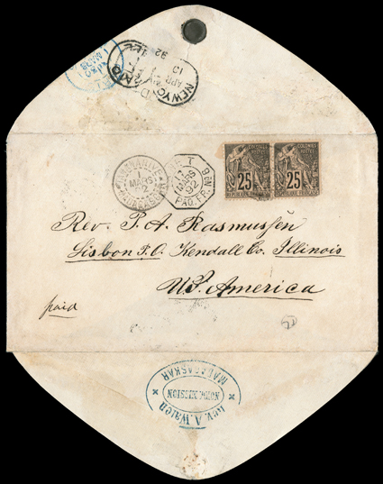 921 c   Image1892 cover from the Norwegian Missionary in Madagascar, two French Colonies 25c stamps tied by Tananarive 1.3.92 c.d.s. on cover to Lisbon, Illinois, with blue handstamp of Rev. A. Walen of the Norwegian Missionary on the backflap, Paris and New York transits, cover opened for display, fine; a very rare early cover of the Norwegian Missionary in Madagascar. (Image) Est. $500-750