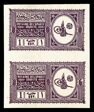 925 og 149 Image#149, 1934 1s Violet brown, vertical pair, imperforate, fresh color on crisp white paper, slightly disturbed o.g., very fine; key high value of the first postage stamp set of the Kingdom of Saudi Arabia. (Image) $2,150.00+