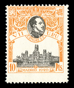 934 nh 318-30 Image#318-30, 1920 1c-10P U.P.U. Congress cplt., fresh mint set, usual variable centering, o.g., n.h., 1c with a pulled perf. at right, otherwise fine-very fine; each signed Soro and the top three values accompanied by his 2008 certificate (Edifil #297-309; €1,775). (Image) $1,200.00