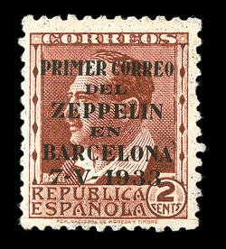 936 nh/og Edifil 662, 671, 673 vars ImageEdifil #662 var., 671 var., 673 var., 1932 "Primer Correo/del/Zeppelin/en/Barcelona/7-V-1933" overprints on 2c Red-brown, 50c Orange and 1P Grey-black cplt., o.g., 50c l.h., the others n.h., fresh and fine; a very elusive set of these Zeppelin overprints, which were privately prepared to commemorate the arrival of the airship on 7 May 1933, but authorization for their issuance was never granted by the Madrid postal authorities, who also neglected to grant permission in time for the Graf Zeppelin to pick up the mails on the appropriate date; Graus certificate (See Edifil Tomo II, page 39). (imagea) (imageb) (Image) Est. $750-1,000