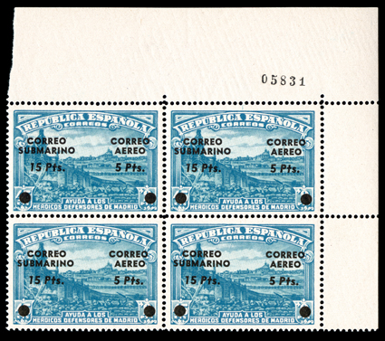 937 nh Edifil 757-58 vars. ImageEdifil #757-58 vars., 1938 "Correo/Submarino/15 Pts." and "Correo/Aereo/5 Pts." fantasy surcharges on 45c+2P Defenders of Madrid, lot comprised of a top right corner margin block of four and two souvenir sheets, one with the stamp printed at a slight diagonal, o.g., n.h., each with a small star handstamp on reverse, very fine and scarce; only 200 of each were surcharged (See Edifil Tomo II, page 113). (Image) Est. $500-750