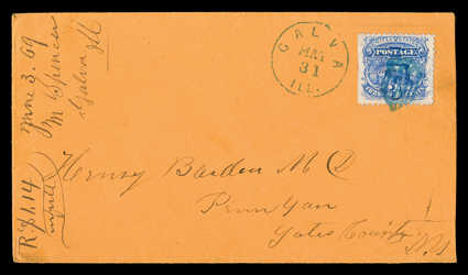 109 c 114 Image#114, 3c Ultramarine, large margined single with natural straight-edge at left tied by fancy blue Shield of Galva, Ill. on orange cover to Penna Yan, N.Y., matching Galva c.d.s. alongside, very fine; an exceptionally pretty cover; 2009 PF certificate. (Image) Est. $500-750