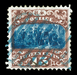 113 O 119 Image#119, 15c Brown and blue, Ty. II, used, deeply rich colors and strong impressions, well centered, blue grid cancel which is most uncommon on this value, choice very fine; 2009 PF certificate. (Image) $335.00