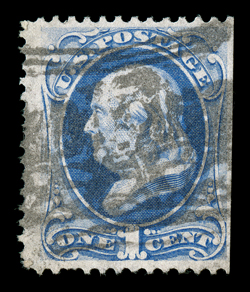 118 O 145 Image#145, 1c Ultramarine, single with straight-edge at right, cancelled by Locomotive of South Hanson, Mass. (Cole #Pi-67), strong rich color, tiny pinhole, fine; one of the rarest and most desirable fancy cancels from the Bank Note era; 2009 Weiss certificate. (Image) Est. $150-200