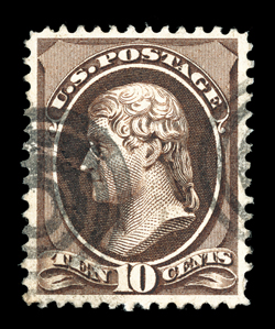 129 O 209b Image#209b, 10c Black brown, used, exceedingly well centered within large margins, strong true Black brown color, target cancels, extremely fine for this difficult and often misidentified stamp; 2011 PF certificate. (Image) $350.00