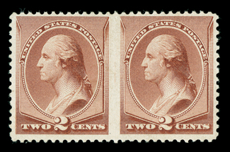 130 og 211Bc Image#211Bc, 2c Pale red brown special printing, horizontal pair, imperforate between, handsome example of this rare error pair, with brilliantly rich color, o.g., lightly hinged, very fine; "HFC" backstamps and accompanied by a 1982 PF certificate; ex-Hansen. (Image) $2,000.00