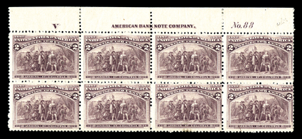 134 ogPB 231 Image#231, 2c Columbian, top margin imprint, letter "V" and plate "No. 88" block of eight, fresh and intact, o.g., minor h.r., six stamps n.h., fine. (Image) $850.00
