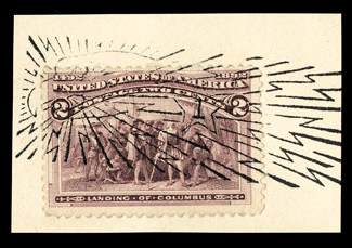 135 p 231 Image#231, 2c Columbian, tied to piece by a nearly full strike of Eagle and Thunderbolts of Boston, Mass., a very fine strike of this scarce cancel that was in use only six hours; 2011 Weiss certificate. (Image) Est. $200-300
