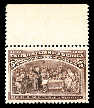 136 nhu 234 Image#234, 5c Columbian, top margin mint single that has uncommonly wide margins, fresh color with a crisp detailed impression, o.g., n.h., extremely fine; 1989 PF certificate and 2011 PSE certificate (XF 90J; SMQ $625.00 for 90 and $1,200.00 for 95). (Image) $210.00