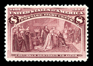 137 nhu 236 Image#236, 8c Columbian, particularly well centered within large margins, lovely rich color, immaculate o.g., n.h., extremely fine; 1984 PF certificate and a 2011 PSE certificate (XF 90; SMQ $450.00). (Image) $180.00