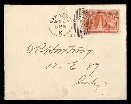 139 c 241 Image#241, $1.00 Columbian, nicely centered and with rich bright color, tied by New York duplex on 1894 local cover, very fine. (Image) $2,000.00